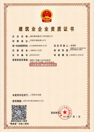 湖北暢泉建設工程有限公司繼去年晉升建筑工程施工總承包和市政公用工程施工總承包“雙貳級”資質后,日前再傳捷報,該公司獲批“建筑機電安裝工程專業承包貳級資質”,實現技術實力再提升、業務范圍再拓展,進一步提高了市場競爭力。下一步,該公司將按照澴川國投堅持改革助推高速高質量發展的總體部署,積極闖市場搶機遇,努力做大規模、做強實體,切實增強盈利能力與創業活力。