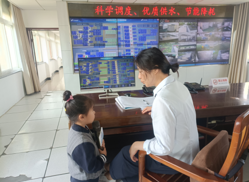 在調(diào)度中心,我公司工作人員告訴小朋友們,市民使用的水是從70公里外的漢江水源輸送過來的,經(jīng)過處理后不間斷地輸送到千家萬戶。并用通俗易懂的方式講解了水從渾濁變清澈的處理過程。
