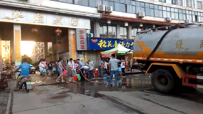 由于取水車出水口位于底盤下,不方便控制,公司現(xiàn)場工作人員特地接裝了一條軟管,幫助居民接水。前來接水的小區(qū)居民較多,工作人員一邊安排取水車不停往返取水,一邊堅守在現(xiàn)場維持秩序,還抽空幫助行動不便的老人送水上樓。前來接水的居民見此情形,也紛紛舉起大拇指點贊。