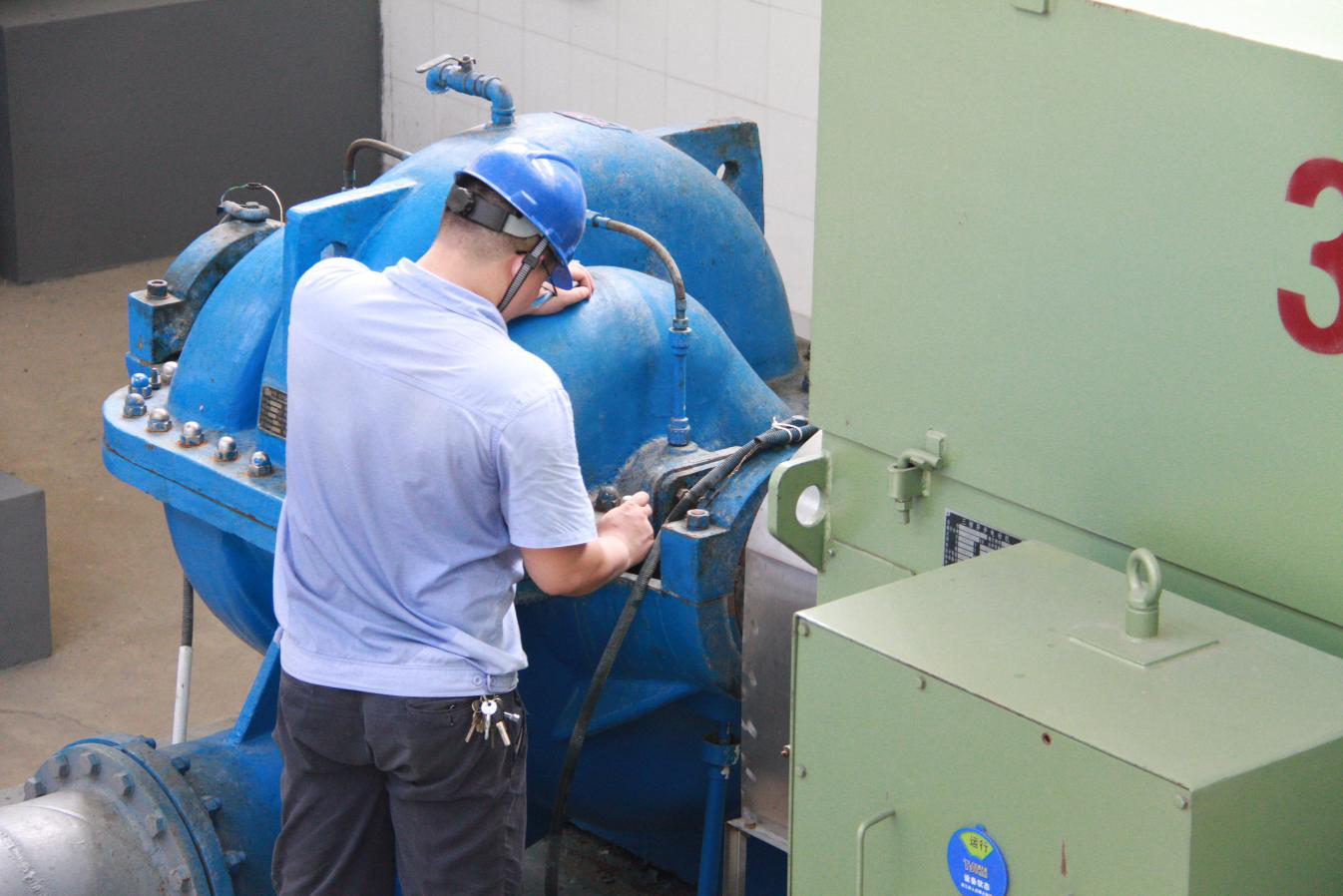 檢測結束后,維修人員又來到了送水泵房,40多度的廠區內,3個大水泵發出巨大的聲音,給原本密閉的廠房又增添了一絲燥熱。送水泵房是供水系統的最后一步,承擔著輸送孝感城區和周邊鄉鎮以及云夢城區和周邊鄉鎮80多萬居民生活用水的重任,水泵一旦出現問題,就會影響居民的正常用水。為了保證用戶的用水安全,維修人員每天都會對送水機組進行檢查和維護。通過用手摸、用眼看、用耳聽,檢查送水機組的運行狀態,確定下一步的維護方案。