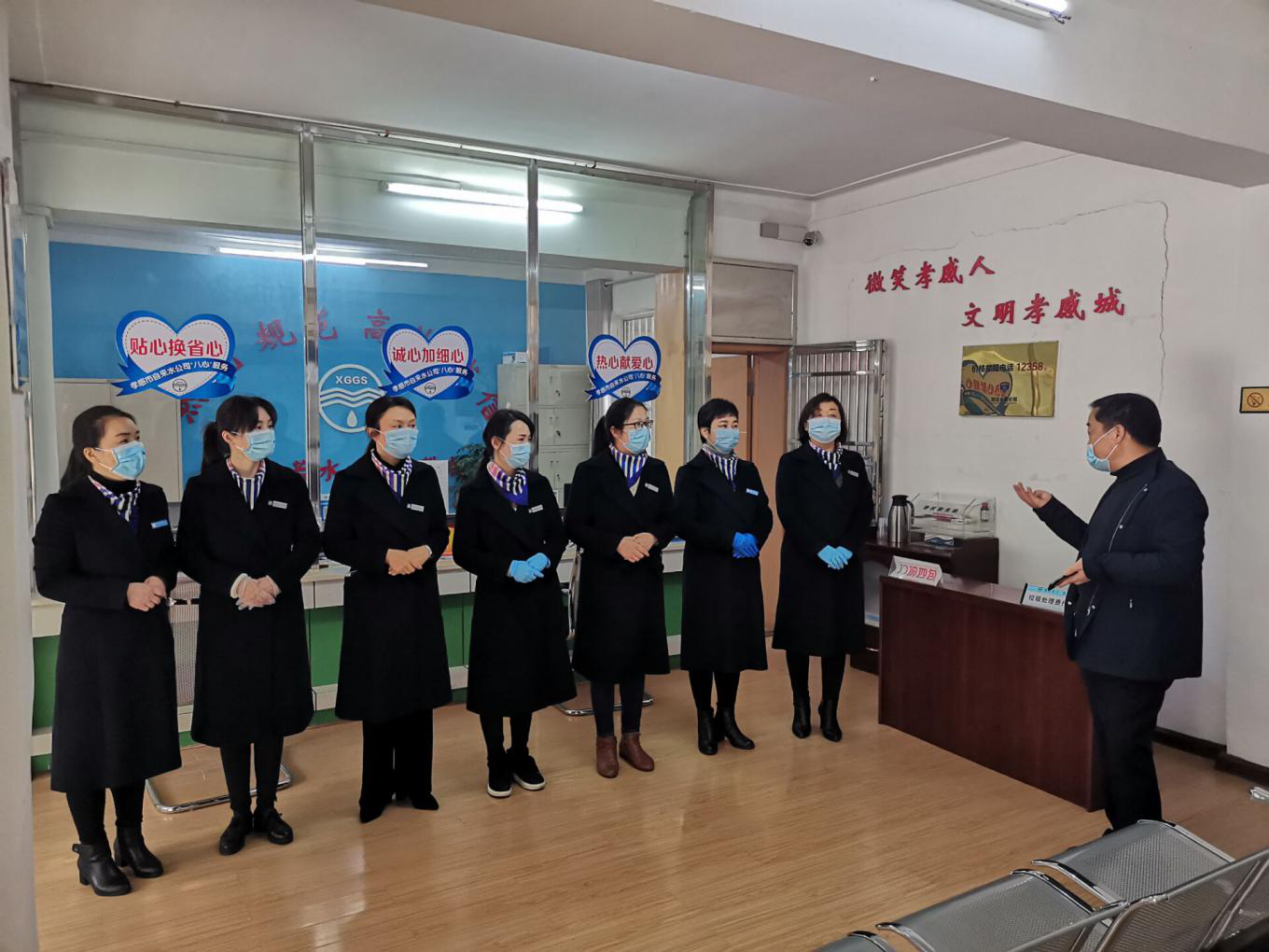 當(dāng)天上午8:00左右,公司所轄的玉泉路、市民之家、城站路三個客服營業(yè)網(wǎng)點(diǎn),早早開門受理業(yè)務(wù)。大廳接待場所全面消殺、門口臨時增放候位板凳、布置安全防護(hù)設(shè)施等等。窗口人員按照要求配帶口罩,久違的微笑、貼心的問候如沐春風(fēng)。