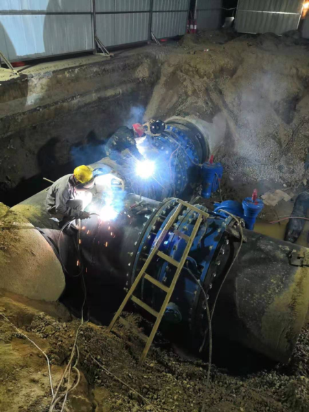 凌晨一點,施工作業車輛正在對原有內徑為1.4米的水泥管道進行破除,待余水放完之后,將會與新的內徑為1.6米的改遷管道進行碰頭連接。為盡快完成施工,公司分班組對兩處碰頭連接工程進行同步實施,電焊工和機械操作人員隨時待命,通宵作業。