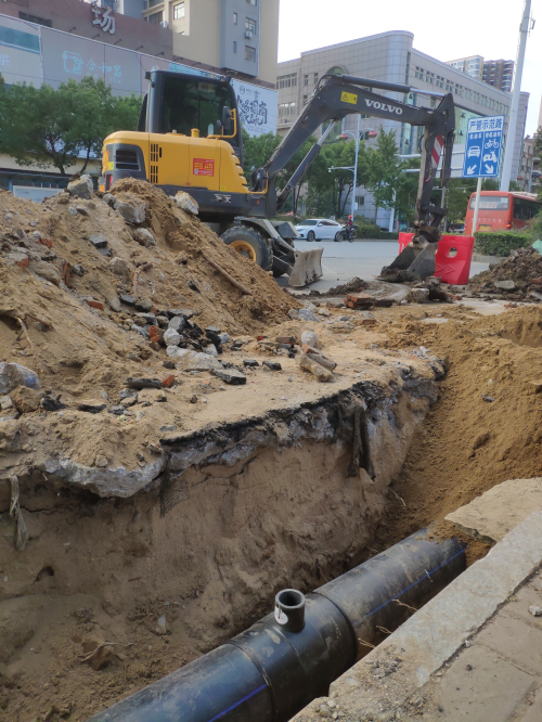 最后我們來到了槐蔭大道與北京路交接處,由于槐蔭大道全線施工改造,位于北京路交接處的供水管道需要向外遷移,現場挖掘機,熱熔機一齊開動,各部門通力合作,密切配合,各司其職,各負其責,一節一節地推進,把工作做實做細。